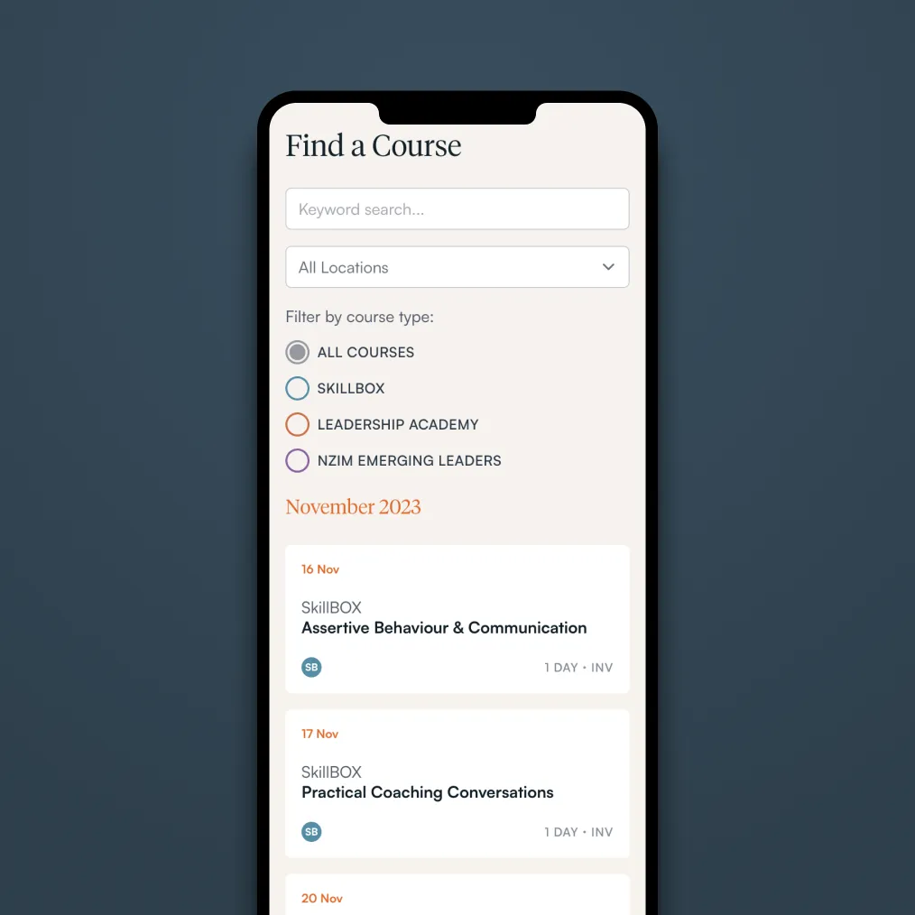 The New Zealand Institute of Management and Leadership (NZIM) is one of Aotearoa’s leading executive and professional training organisations, running programmes throughout the country from Auckland to Invercargill.